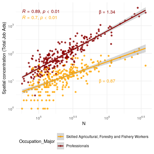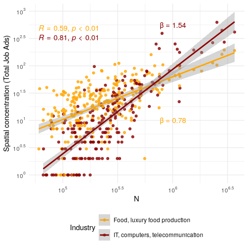 Figure above: The Spatial concentration of jobs on the German labour market. Scaling relations between the population of a Labour Market Area and the total number of job advertisements recorded in different (left) industries and (right) occupations.