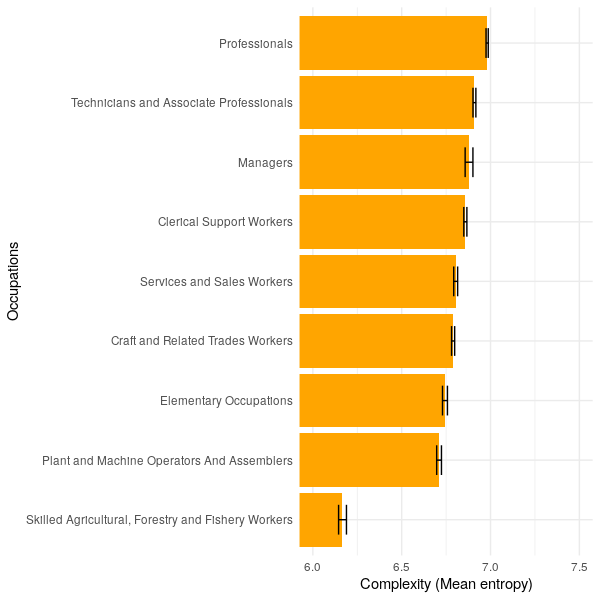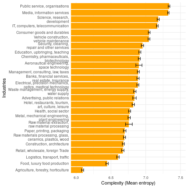 Figure above: Differences in complexity among (left) industries and (right) occupations. Bootstrapped confidence intervals (10,000 re-sampling iterations) reveal significant differences in knowledge complexity (Shannon-entropy of job advertisements) among industries and occupations.