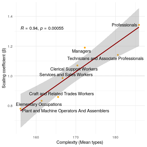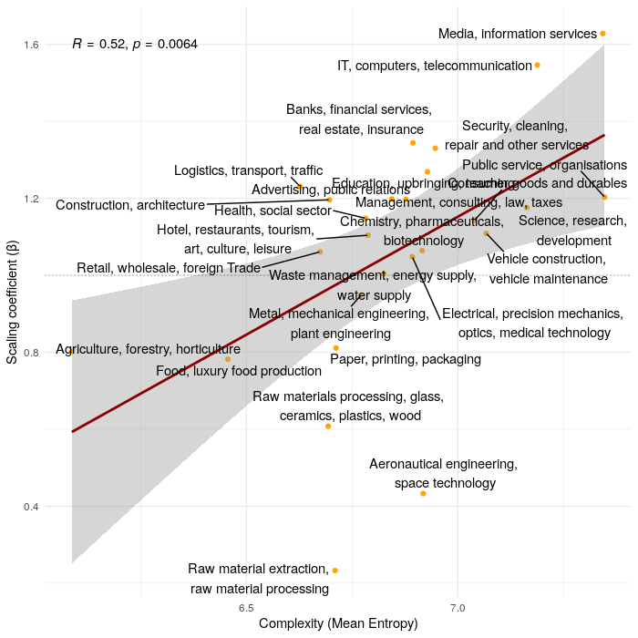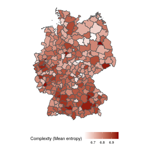 Figure above: Knowledge complexity (Shannon-entropy of job advertisements) agglomerates in large metropolitan areas.